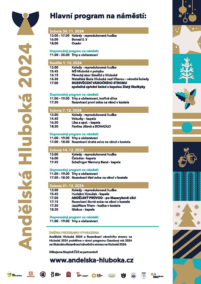 The town of Hluboká nad Vltavou cordially invites you to the Advent program on the square. Christmas markets, feasts and a rich musical program await you, which will take place on Saturday, November 30, December 7, December 14 and December 21, and on Sunday, December 1, 2024, from 5 p.m., we will light the Christmas tree with the ČEZ Group. On the last Saturday, come to the Angel Parade along Masarykova Street (meeting at Schwarzenberg Kindergarten).