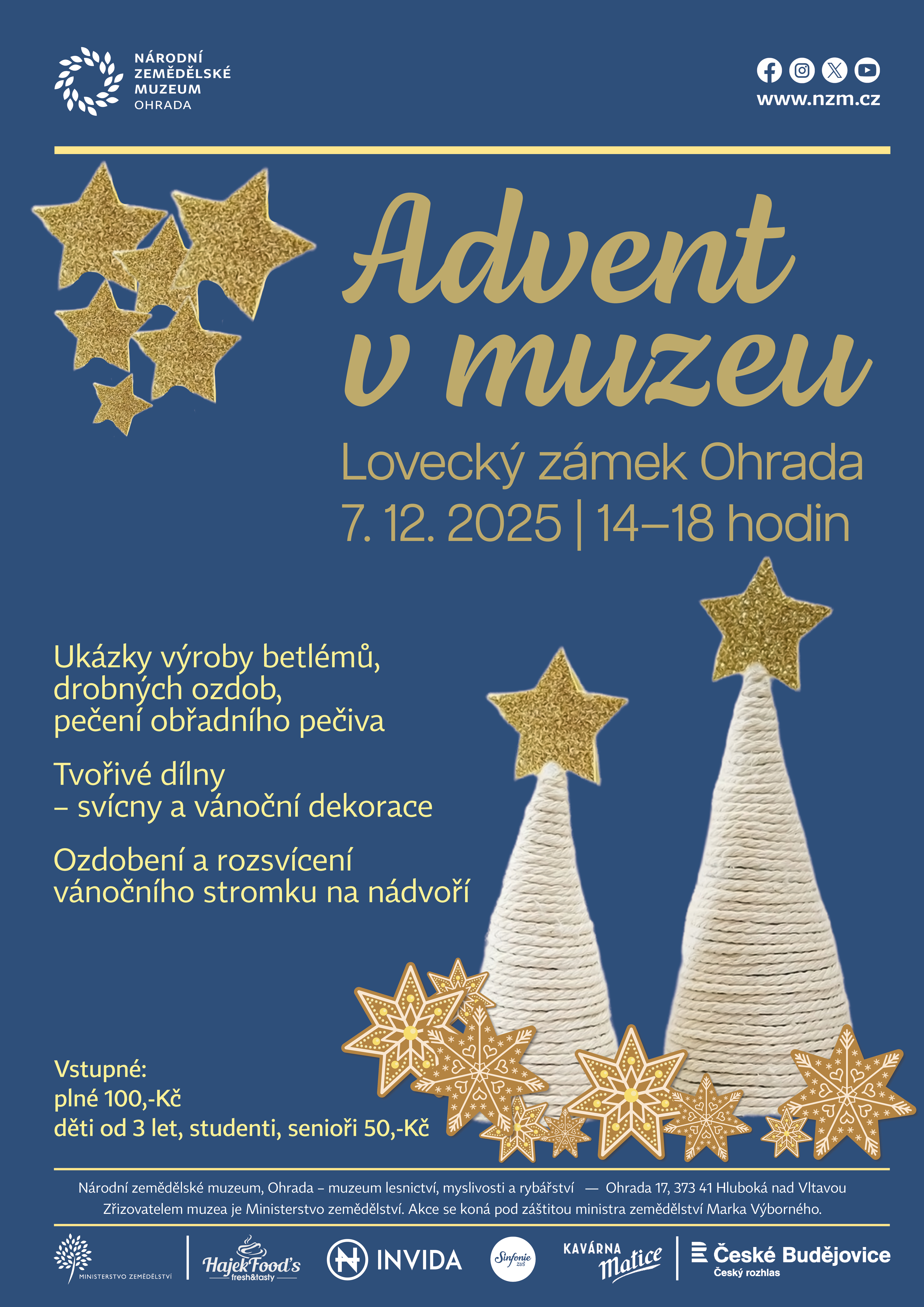 Zveme všechny, kteří se chtějí zastavit v předvánočním shonu, zazpívat koledy, vytvořit drobný dárek pro radost a v závěru programu na nádvoří ozdobit a rozsvítit vánoční stromeček, do Muzea lesnictví, myslivosti a rybářství na lovecký zámek Ohrada!