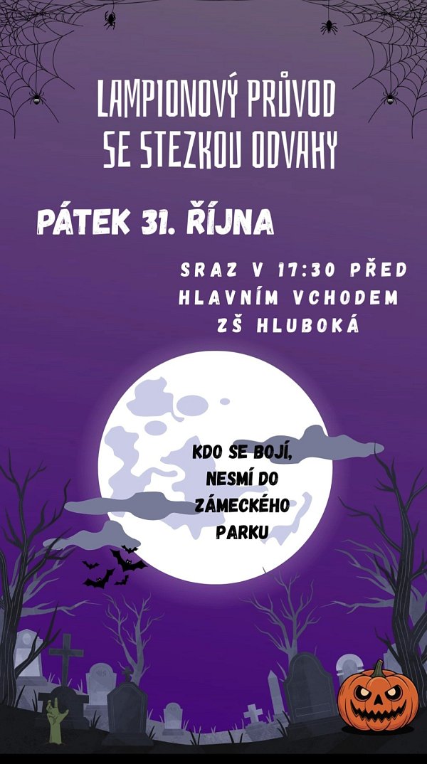 Centrum volného času Poškolák vás opět zve na tradiční "trochu" strašidelný Lampionový průvod se stezkou odvahy zámeckým parkem. V pátek 31. října 2025, sraz v 17.30 hodin před hlavním vchodem základní školy.