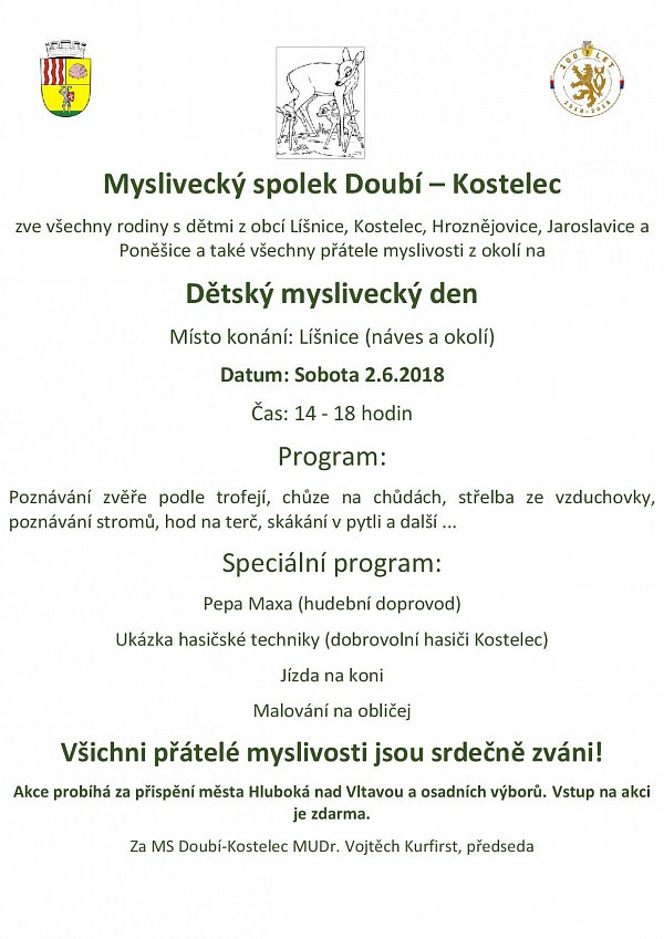 Myslivecký spolek Doubí - Kostelce zve všechny rodiny s dětmi z obcí Líšnice, Kostelec, Hroznějovice, Jaroslavice a Poněšice a také všechny přátele myslivosti z okolí na Dětský myslivecký den na náves obce Líšnice.